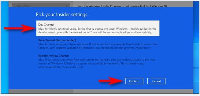 Après avoir lié votre compte Windows Insider, il vous sera demandé de « Choisir vos paramètres Insider ». Choisissez « Canal de développement » pour obtenir l’aperçu windows 11 Insider, puis cliquez sur « Confirmer ».